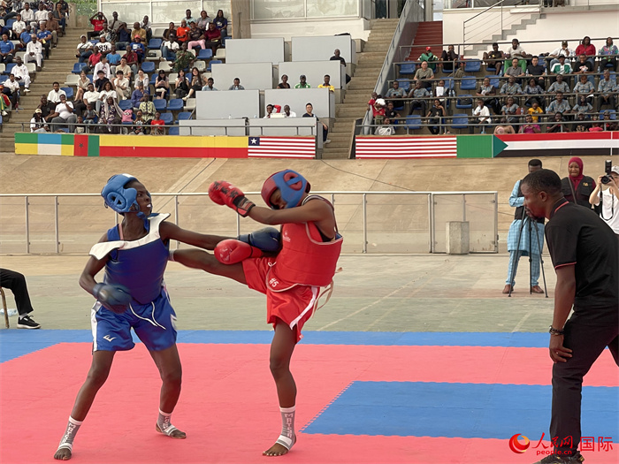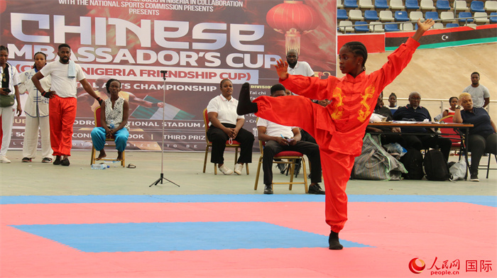 決賽活動現(xiàn)場,來自尼日利亞各地的武術(shù)愛好者圍繞太極、套路、男子散打、女子散打、創(chuàng)意表演、團(tuán)體比賽等六個比賽項目展開激烈角逐。場上,選手們一招一式,有板有眼,充分展示了中國武術(shù)文化蘊(yùn)含的堅韌、拼搏精神,贏得了觀眾陣陣掌聲與歡呼聲。