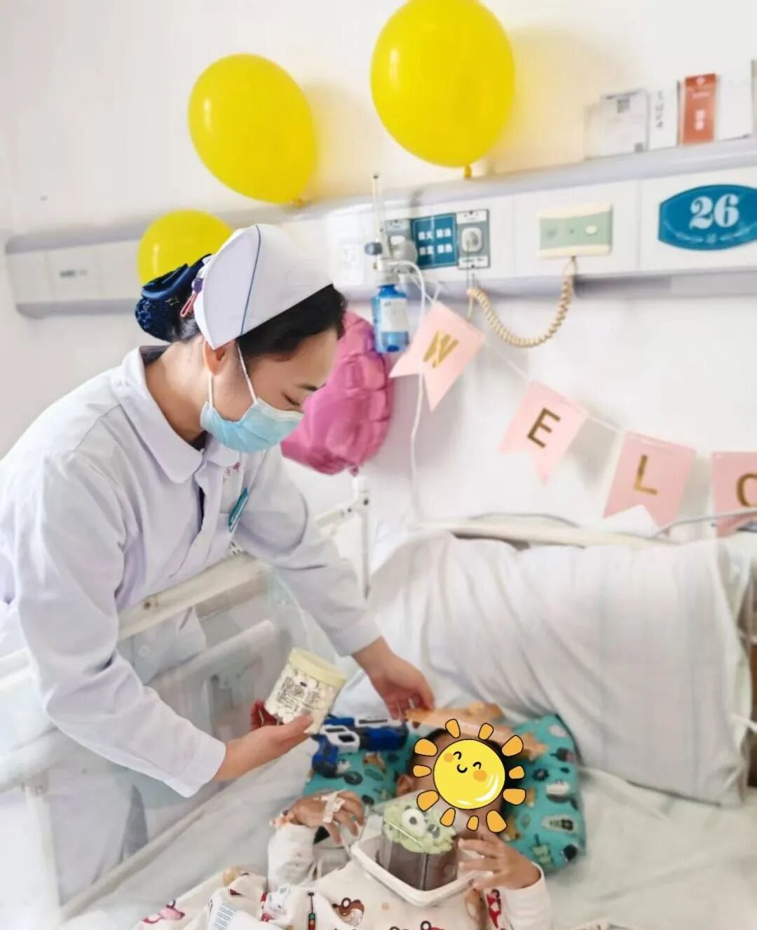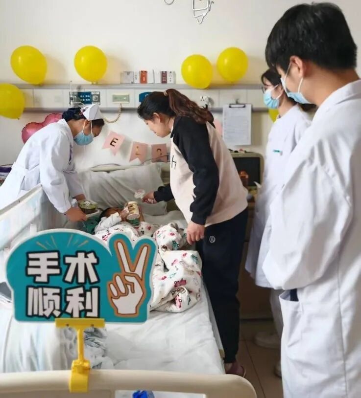 手術當天,科室全體醫(yī)護人員在全力保障手術順利進行的同時,也在為生日會忙碌著。幾位已下夜班的護士主動放棄休息,自發(fā)承擔起生日會的籌備工作:有的專程前往取預定好的小蛋糕,有的蹲在病房角落認真吹著彩色氣球,還有人精心挑選卡通貼紙,將病房的窗戶、柜子裝點得童趣盎然。