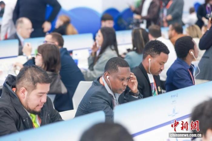 11月5日,第八屆中國(guó)國(guó)際進(jìn)口博覽會(huì)暨虹橋國(guó)際經(jīng)濟(jì)論壇開幕式在國(guó)家會(huì)展中心(上海)舉行。圖為外國(guó)媒體記者在新聞中心收聽開幕式上的嘉賓發(fā)言。中新社記者 賈天勇 攝