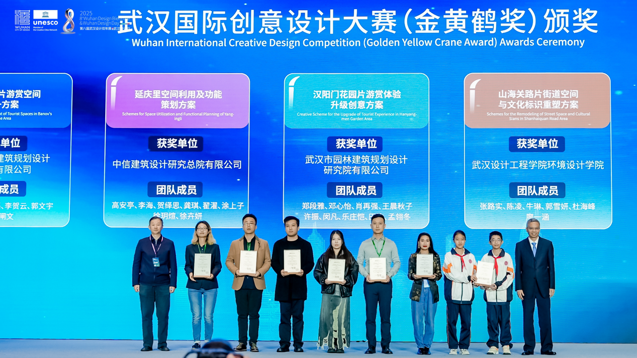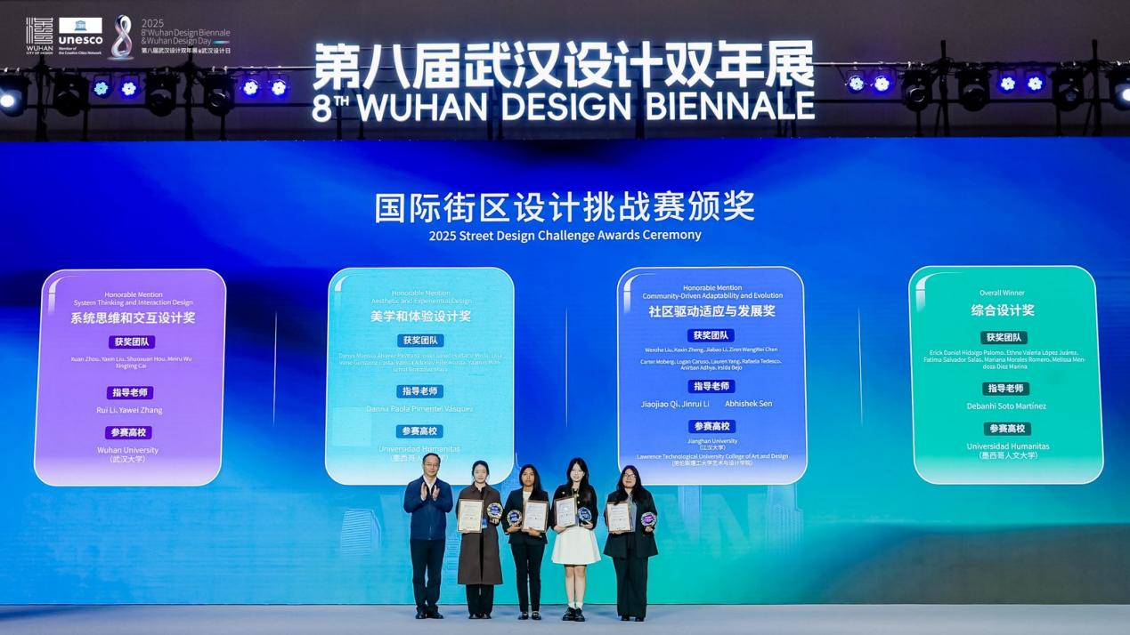 開(kāi)幕式上,2025年武漢國(guó)際創(chuàng)意設(shè)計(jì)大賽(金黃鶴獎(jiǎng))與 2025年國(guó)際街區(qū)挑戰(zhàn)賽頒獎(jiǎng)儀式同步舉行。其中,象征武漢設(shè)計(jì)創(chuàng)新探索的“金黃鶴獎(jiǎng)”,今年特意選取黃鶴樓、山海關(guān)路、漢陽(yáng)門等市民常去、關(guān)注度高、滿滿煙火氣的城市地標(biāo)作為設(shè)計(jì)對(duì)象,不限專業(yè)和地域,征集更宜人的更新提升方案?,F(xiàn)場(chǎng),武漢瑞拓建筑設(shè)計(jì)咨詢有限公司等6個(gè)專業(yè)組一等獎(jiǎng)和最佳組織獎(jiǎng)武漢市七一華源中學(xué)等獲獎(jiǎng)代表接受頒獎(jiǎng)。國(guó)際街區(qū)挑戰(zhàn)賽,則是由聯(lián)合國(guó)教科文組織設(shè)計(jì)之都城市聯(lián)合舉辦,全球高校團(tuán)隊(duì)共同參與的國(guó)際設(shè)計(jì)賽事。經(jīng)過(guò)全球30位權(quán)威專家1個(gè)月的精心細(xì)致評(píng)審,選出了四個(gè)優(yōu)勝方案?,F(xiàn)場(chǎng),為交互設(shè)計(jì)獎(jiǎng)獲獎(jiǎng)團(tuán)隊(duì)武漢大學(xué)、美學(xué)設(shè)計(jì)獎(jiǎng)獲獎(jiǎng)團(tuán)隊(duì)墨西哥人文大學(xué)、社區(qū)發(fā)展獎(jiǎng)獲獎(jiǎng)團(tuán)隊(duì)江漢大學(xué)團(tuán)隊(duì)和美國(guó)勞倫斯理工大學(xué)團(tuán)隊(duì),以及綜合設(shè)計(jì)獎(jiǎng)獲獎(jiǎng)團(tuán)隊(duì)墨西哥人文大學(xué)頒獎(jiǎng)。