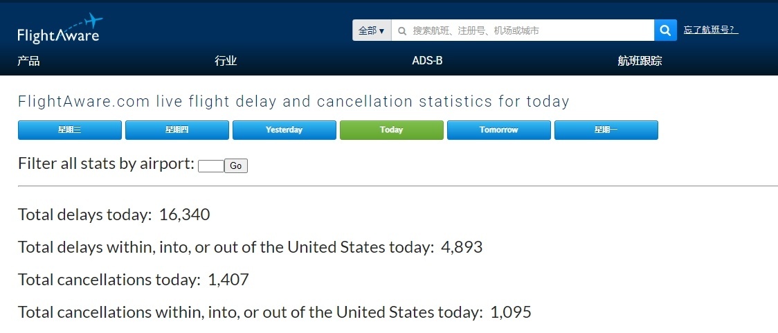 △航班追蹤網(wǎng)站截圖,美國部分出現(xiàn)延誤情況的機場