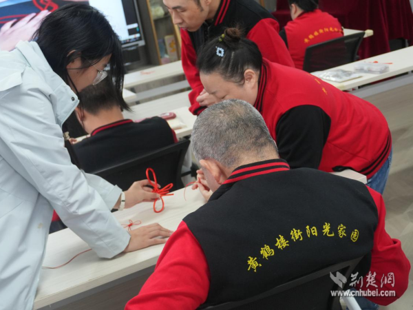 在中國結(jié)編織互動中,志愿者手把手教學員編織寓意吉祥的中國結(jié)。編織過程既鍛煉了手部協(xié)調(diào)能力,又通過互幫互助增進了彼此情誼,現(xiàn)場充滿歡聲笑語?;顒游猜?,青年志愿者為每位學員送上自己親手制作的中國結(jié),傳遞美好祝福。