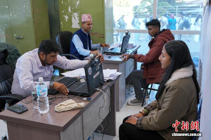 當?shù)貢r間11月11日,尼泊爾加德滿都,工作人員在加德滿都地區(qū)選舉辦公室為年輕人注冊選民信息。中新社記者 崔楠 攝