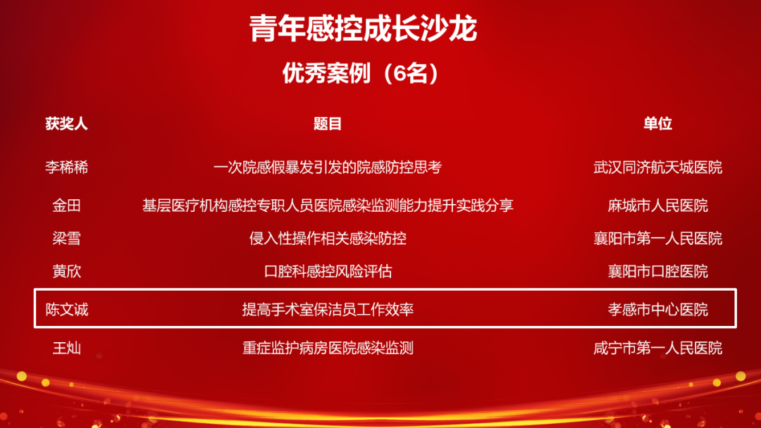 荊楚網(湖北日報網)訊(通訊員 陳軍)近日,在華中科技大學同濟醫(yī)學院附屬同濟醫(yī)院與國家重大公共衛(wèi)生事件醫(yī)學中心聯(lián)合主辦的“第一屆同濟感控學術會議”上,孝感市中心醫(yī)院手術室護士陳文誠榮獲“優(yōu)秀青年感控學者”稱號。由陳文誠主導的感控案例《提高手術室保潔人員工作效率》,在會議同期舉辦的第三屆青年感控成長沙龍中表現(xiàn)出色,榮獲“優(yōu)秀案例”。