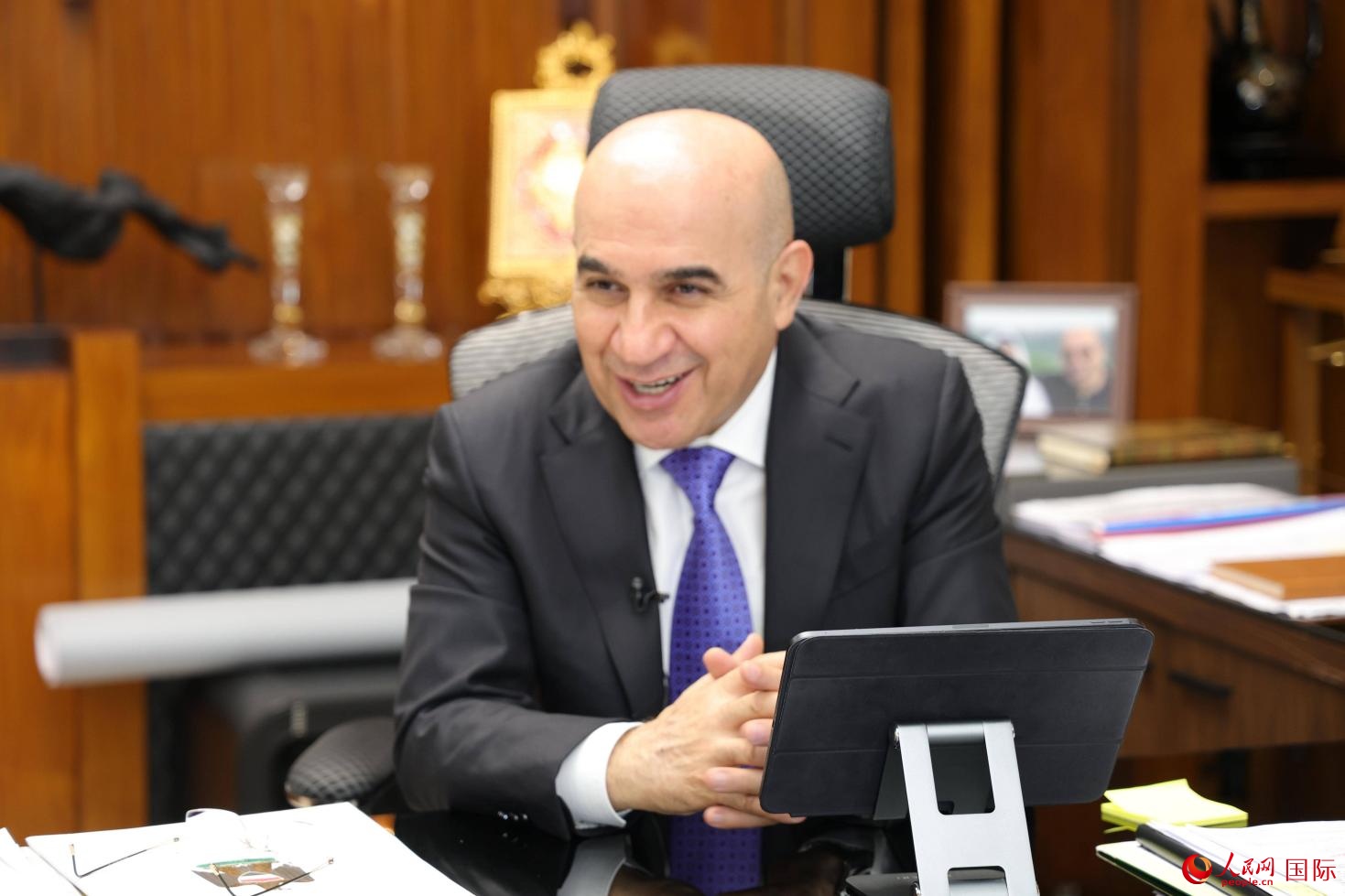 伊拉克住建部部長雷卡尼接受采訪。人民網(wǎng) 伊納斯·易卜拉欣攝