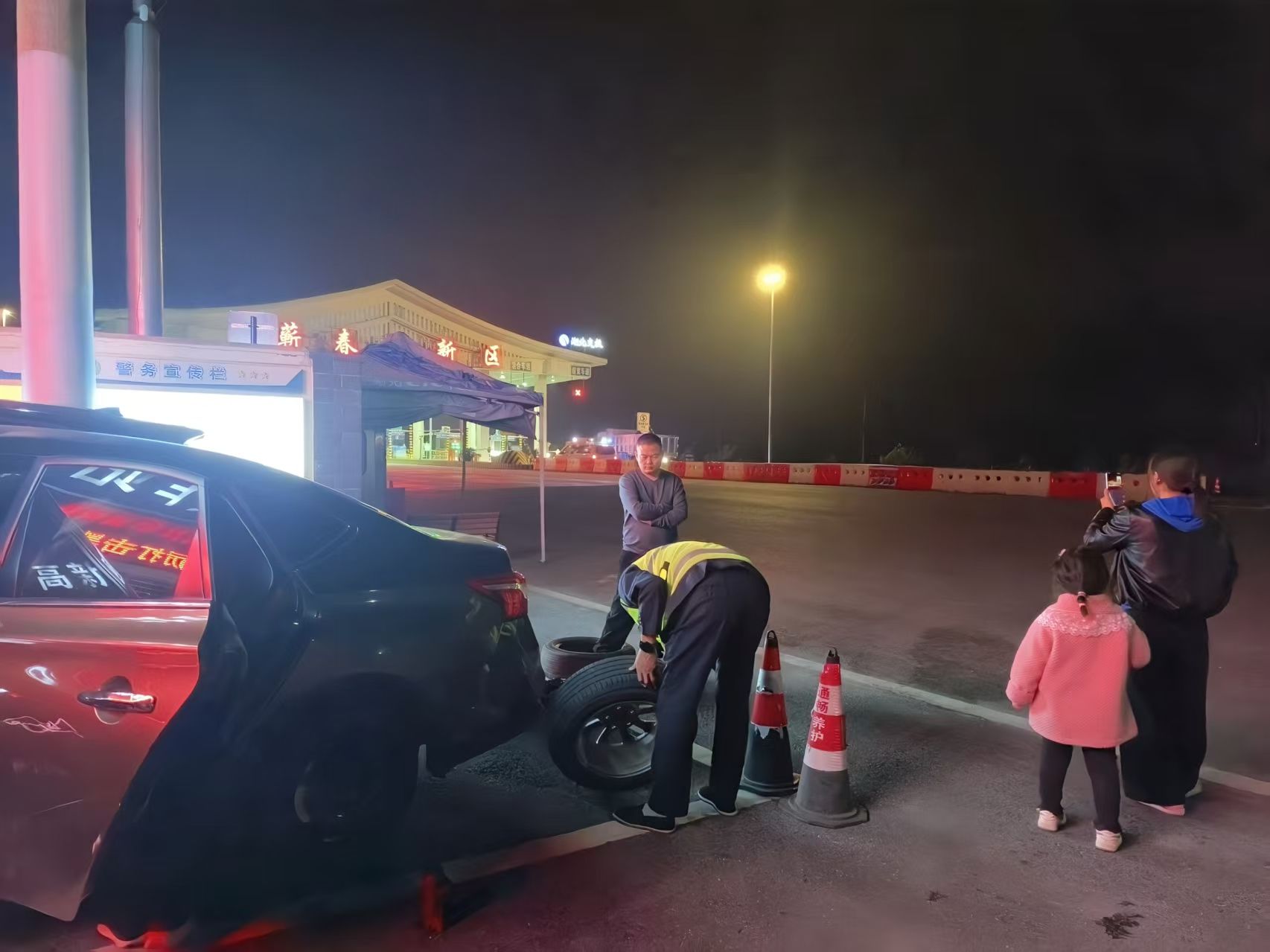 “您別著急,我來幫您處理?!钡弥闆r后,收費(fèi)站工作人員舒師傅主動上前。他迅速從站內(nèi)工具間取出千斤頂、扳手等工具,蹲在車旁忙活起來。深秋的傍晚寒意漸濃,舒師傅的額角卻滲出細(xì)密汗珠,經(jīng)過十幾分鐘的緊張操作,破損輪胎被成功換下,備胎安裝到位。