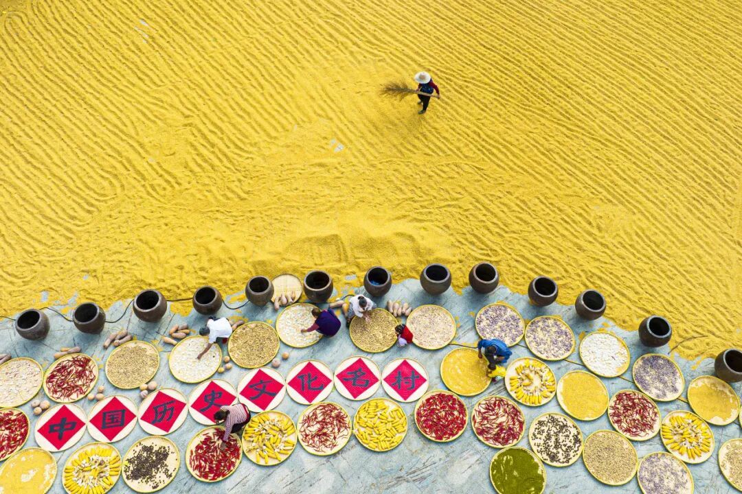 1.古村屋頂平拍農(nóng)作物在陽光下鋪展的鮮活感。