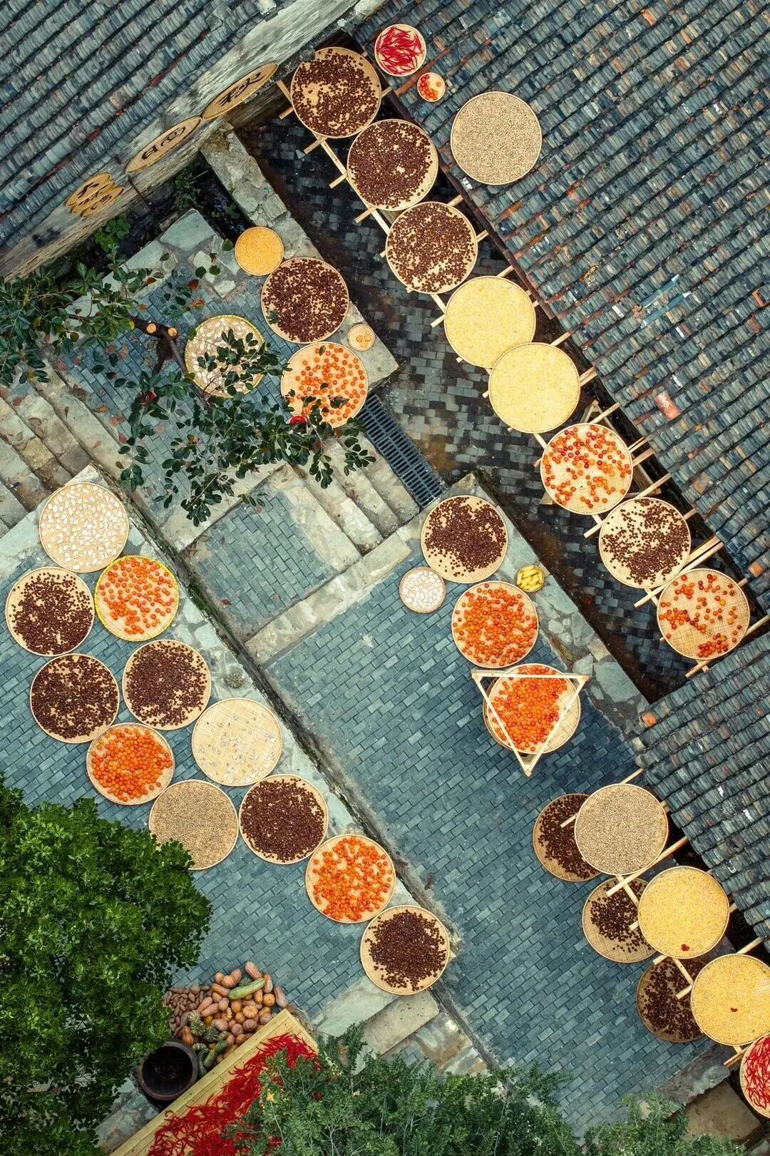 這不是擺設(shè)或表演,是真實(shí)的生活場景。家家戶戶門口擺放的竹匾里,晾曬的是他們一年勞作的收獲。