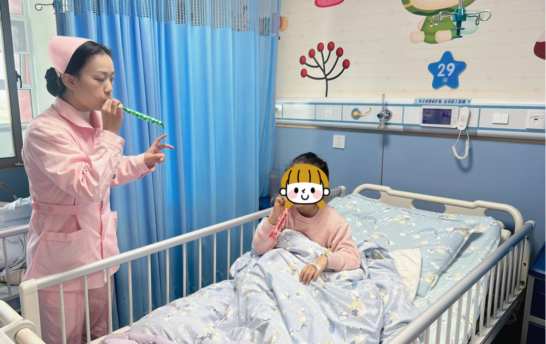 “來(lái),一二三吸氣,一二三呼氣,慢慢吹……”胡祎夢(mèng)一邊溫柔地喊著口令,一邊用彩色長(zhǎng)管做著示范。這并非簡(jiǎn)單的游戲互動(dòng),而是針對(duì)患兒設(shè)計(jì)的主動(dòng)呼吸循環(huán)技術(shù)趣味教學(xué)——將專業(yè)的康復(fù)訓(xùn)練轉(zhuǎn)化為“吹吸管挑戰(zhàn)”,讓小朋友在輕松的氛圍中自然掌握呼吸節(jié)奏控制技巧。這種寓教于樂的方式,不僅有效鍛煉了患兒的呼吸肌功能、助力痰液排出,更成功驅(qū)散了疾病治療帶來(lái)的枯燥與焦慮,讓病房里的康復(fù)訓(xùn)練充滿歡聲笑語(yǔ)。