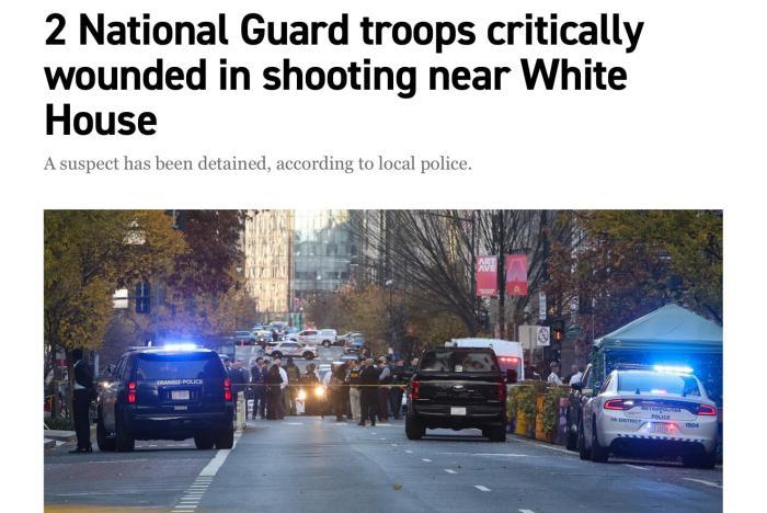 據(jù)警方官員稱,國民警衛(wèi)隊成員當(dāng)時正在執(zhí)行巡邏,突然遭到槍擊。警方還稱,現(xiàn)場已得到控制,涉嫌開槍者已被“制服”并被拘捕,但同時建議民眾避開該區(qū)域。