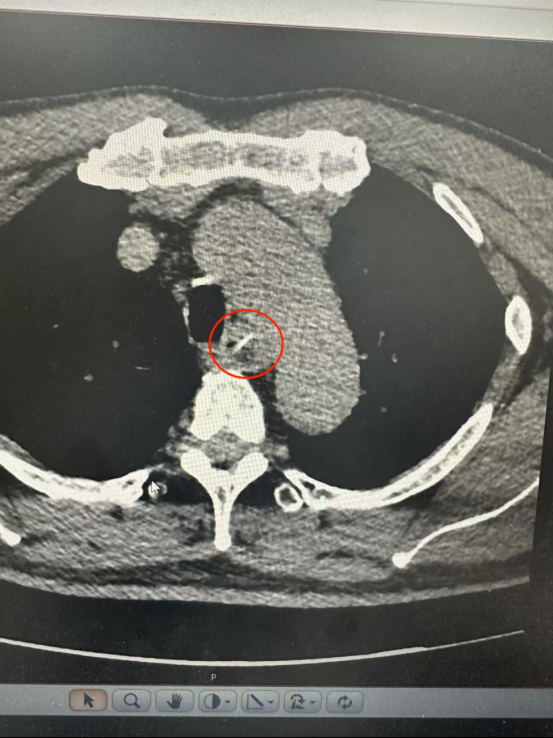 CT結果顯示一根長約25毫米的魚骨卡在食管中段,兩端分別緊貼食管管壁外緣與主動脈弓內側。主動脈是人體最粗大的動脈血管,魚骨所處位置極為危險。