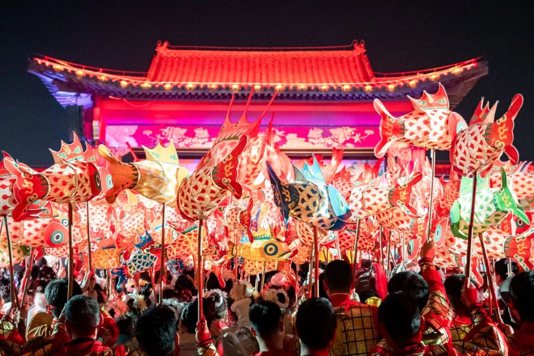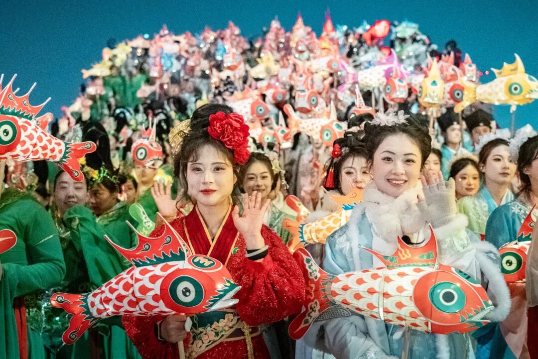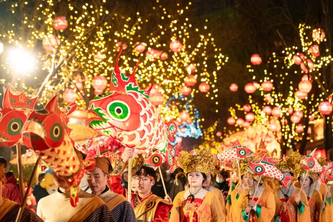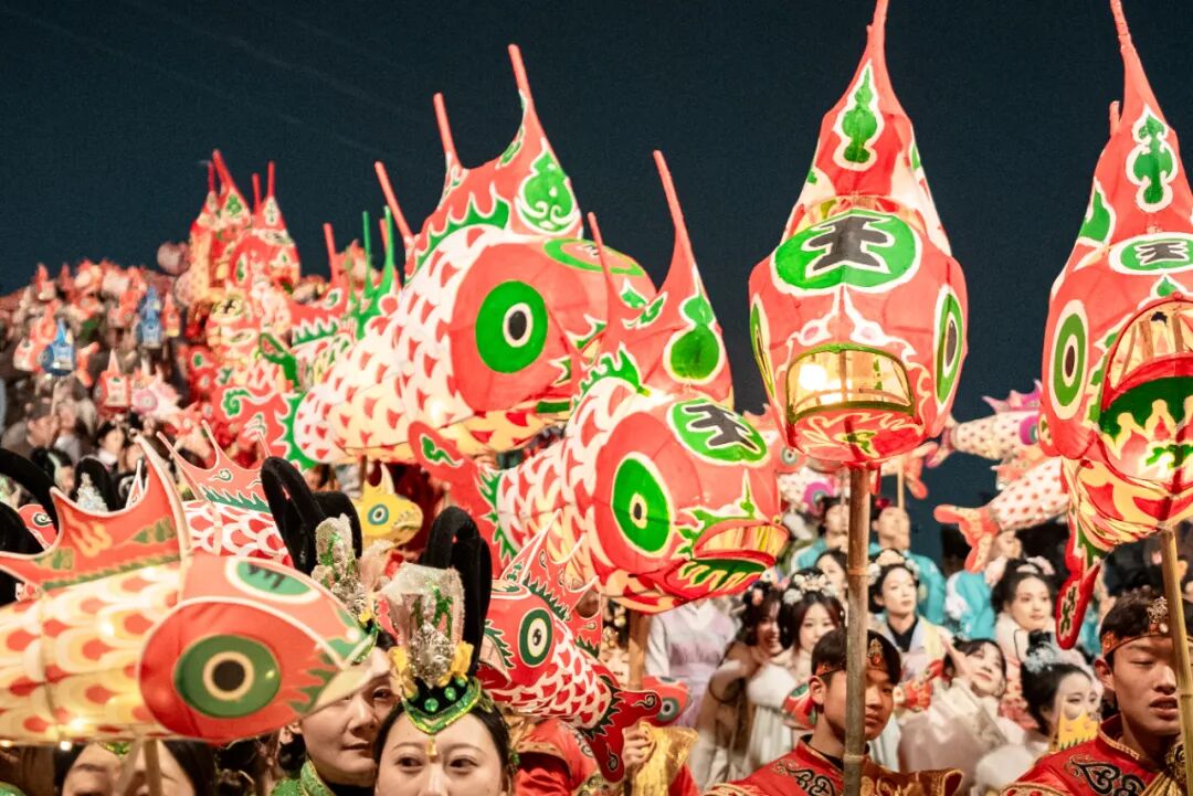 夜幕降臨,華燈初上,數(shù)萬(wàn)盞魚燈匯聚成一條蜿蜒的光帶,在古色古香的虹橋、街巷間緩緩游動(dòng),正如詞中所言,鳳簫聲動(dòng),玉壺光轉(zhuǎn),一夜魚龍舞。