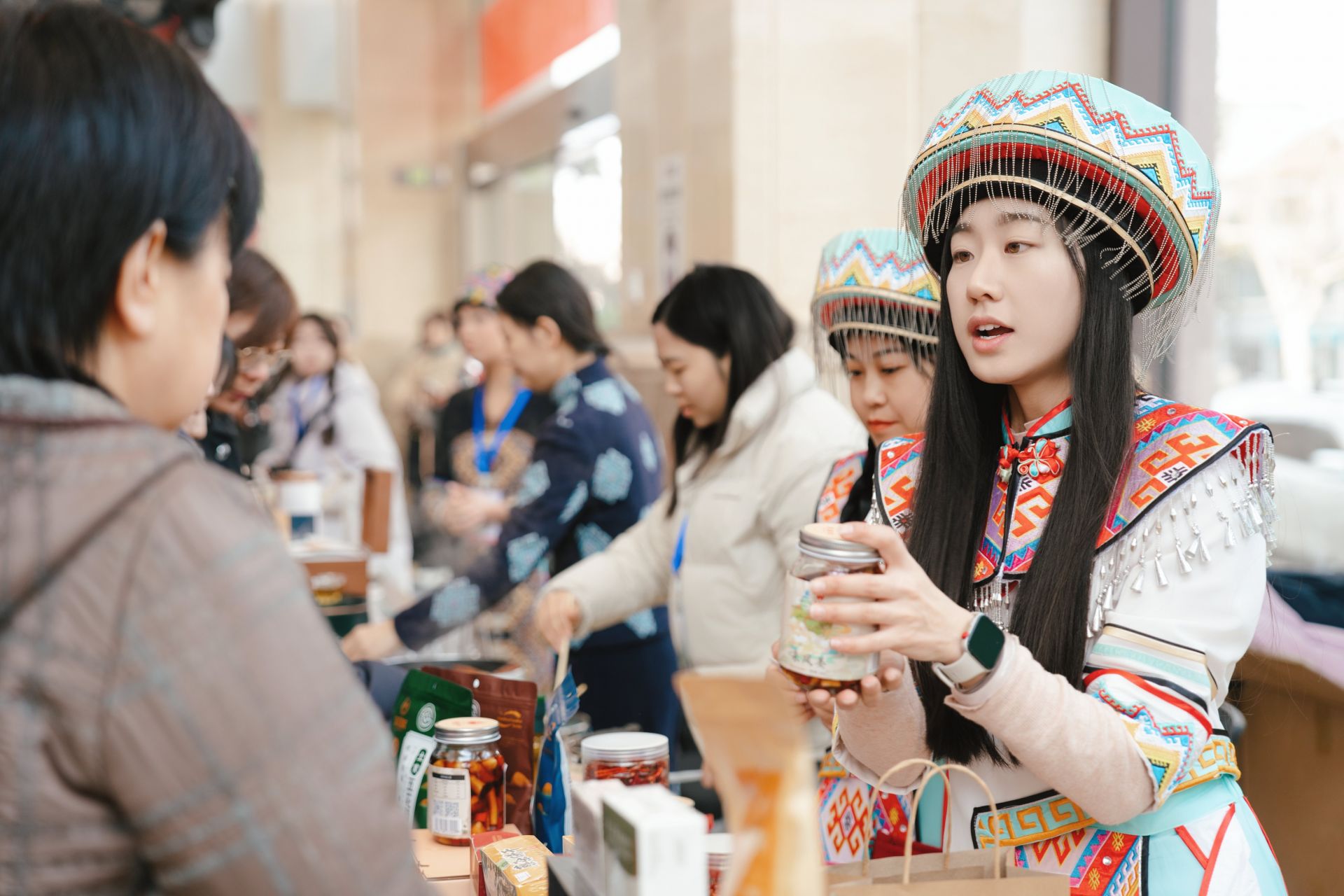 “這個(gè)香腸嚼著香,再給我裝兩斤!”“臘肉聞著就流口水,正宗土家味!”“有機(jī)山茶油好,既能炒菜又能護(hù)膚,給家里老人帶兩瓶!”贊嘆聲、詢價(jià)聲、掃碼支付聲此起彼伏,各個(gè)展臺前都排起了小隊(duì)。這些來自武陵山區(qū)的天然物產(chǎn),輔以傳統(tǒng)工藝制作,成為現(xiàn)場最搶手的“香餑餑”。此外,刺繡香包、竹編工藝品等非遺手作也備受青睞。