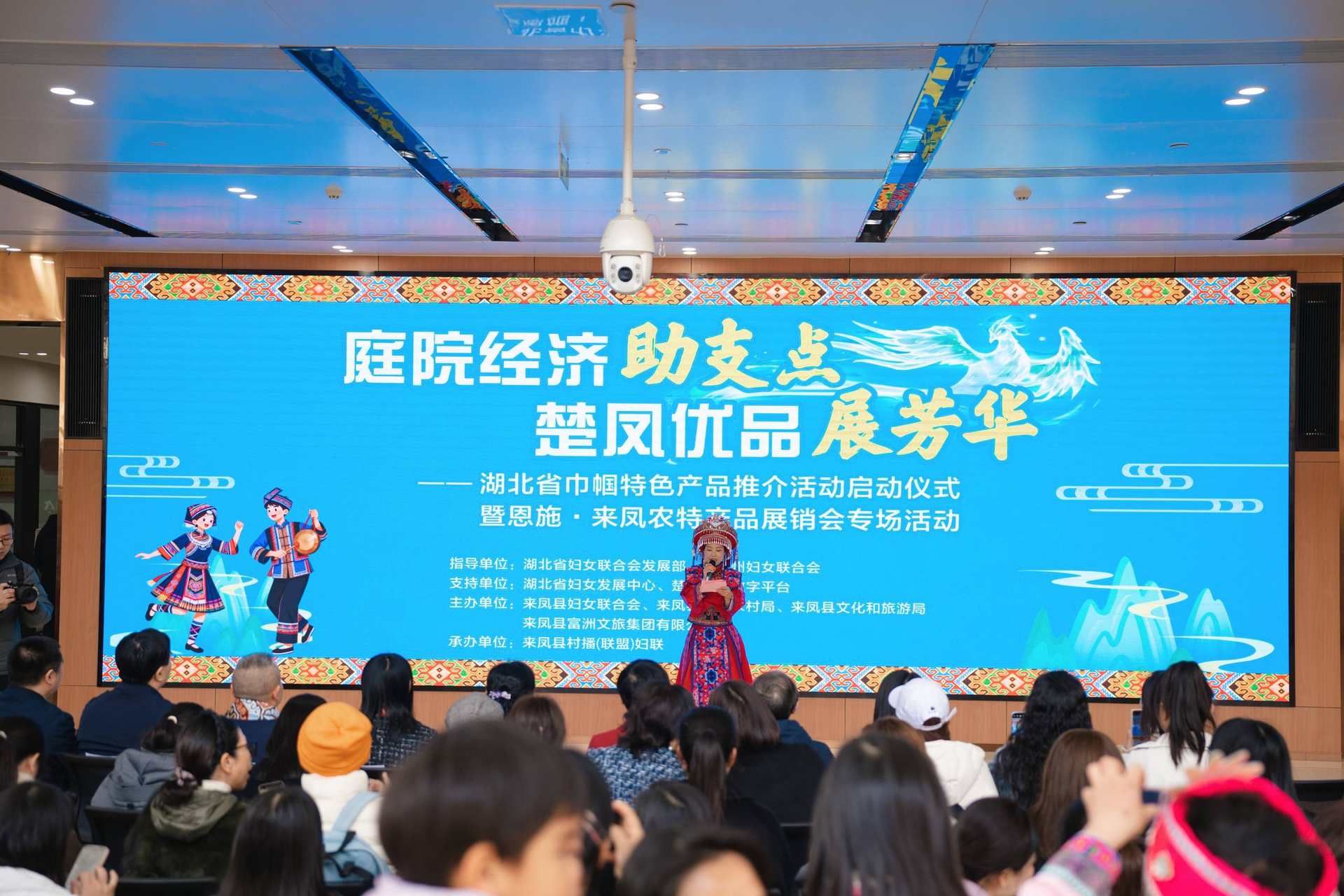 “‘庭院經(jīng)濟(jì)助支點(diǎn) 楚鳳優(yōu)品展芳華’湖北省巾幗特色產(chǎn)品推介活動(dòng)啟動(dòng)!”隨著省婦聯(lián)領(lǐng)導(dǎo)的話音落下,歡快的擺手舞旋律響徹全場?,F(xiàn)場觀眾與舞者攜手共舞,感受土家族“以舞會友”的獨(dú)特待客之道。