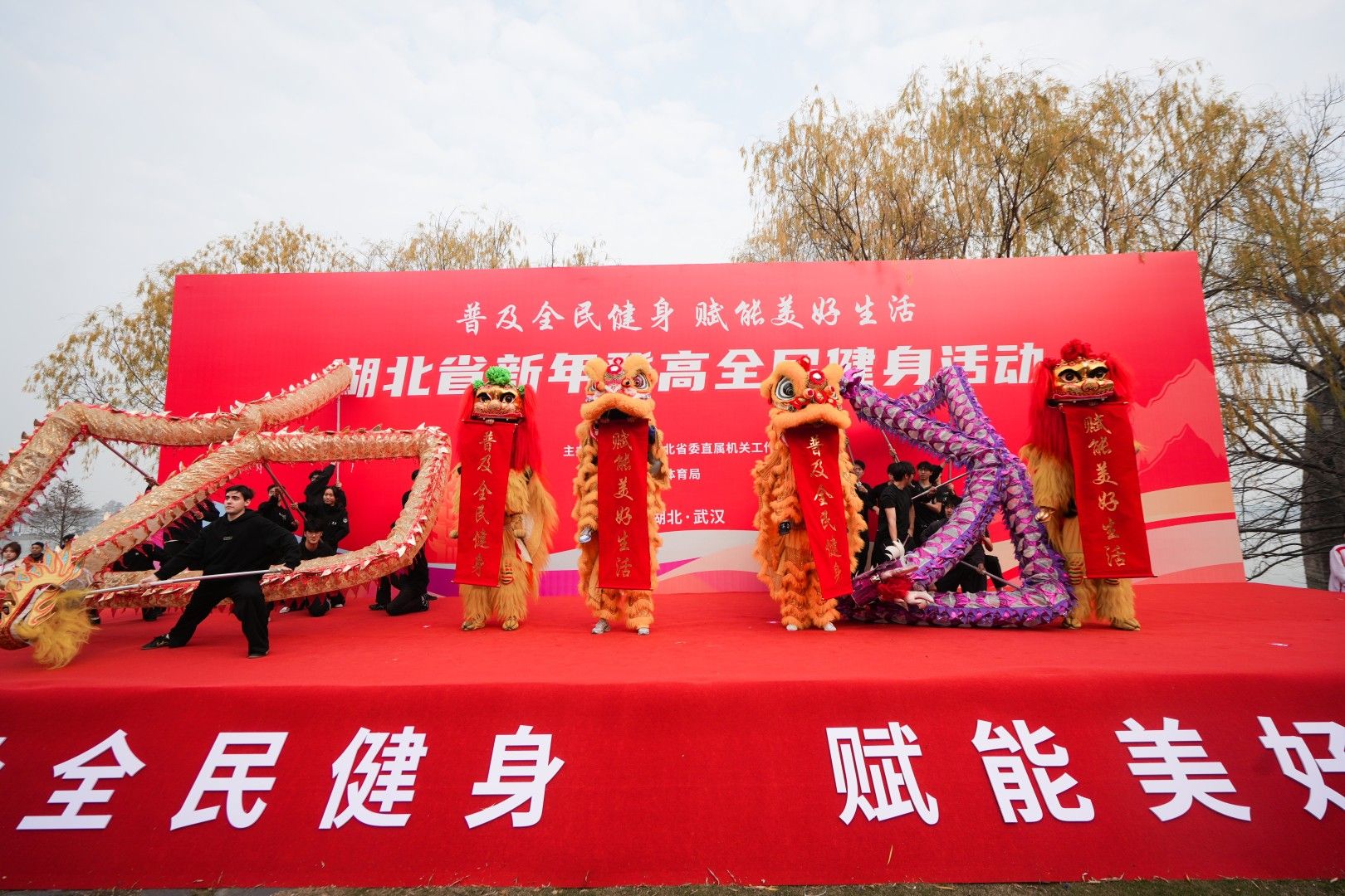 啟動儀式在青春活力的氛圍中拉開帷幕。武漢體育學院的啦啦操表演展現了新時代青年蓬勃向上的精神風貌。武漢理工大學帶來的太極拳及武術表演盡顯中華傳統體育文化魅力;智能機器人登臺起舞,以精準動感的舞姿展現科技與運動的創(chuàng)新融合,隨后更化身“科技領操員”,與健身教練協同帶領全場熱身,生動演繹了人機協作的智能健身場景。湖北大學舞龍舞獅隊壓軸登場,精湛技藝將現場氣氛推向高潮?;顒蝇F場,第十五屆全國運動會男子100米、男子4×100米接力冠軍李澤洋發(fā)出全民健身倡議,“用體育鍛煉點亮生活,為支點湖北建設注入全民健身力量?!?/p>