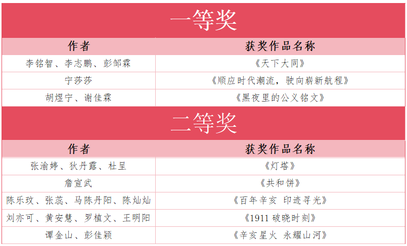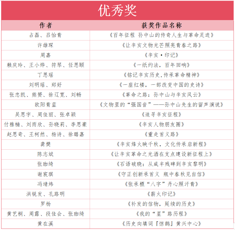 恭喜所有獲獎(jiǎng)?wù)?!再次感謝所有參賽者的積極參與,我們相信,你們的熱忱與創(chuàng)意將推動(dòng)辛亥革命精神在新時(shí)代廣闊征程中賡續(xù)傳承,期待未來(lái)每一位參賽者都能在文物保護(hù)與傳播的實(shí)踐中,繼續(xù)書寫屬于自己的精彩篇章!