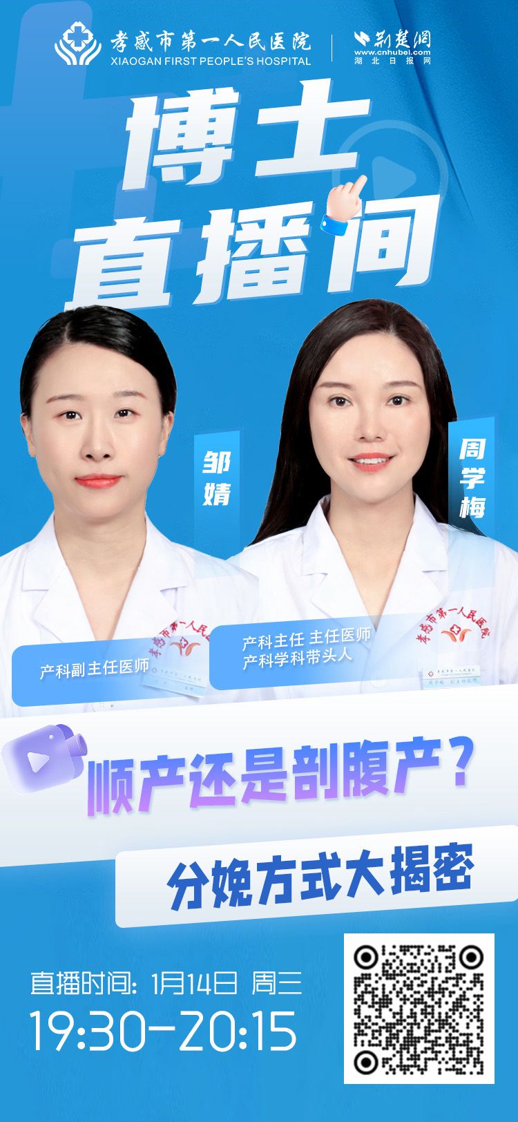 2026年1月14日(周三)19:30-20:15,孝感市第一人民醫(yī)院博士直播間,特邀產(chǎn)科主任周學梅、產(chǎn)科醫(yī)生鄒婧,結合數(shù)十年臨床經(jīng)驗,為你深度解析順產(chǎn)與剖腹產(chǎn)的核心問題:
