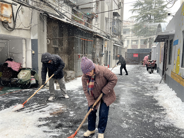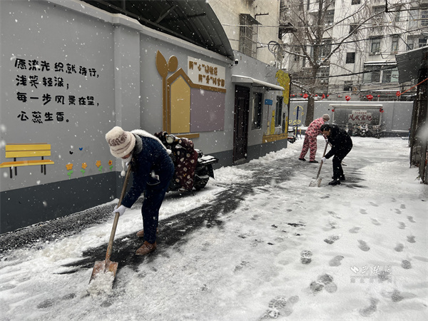 一大早,三名居民志愿者便率先行動(dòng),有人清掃路面浮雪,有人揮舞鐵鍬鏟除薄冰,還有人主動(dòng)疏導(dǎo)過(guò)往居民,提醒大家小心路滑。在志愿者的帶動(dòng)下,越來(lái)越多居民走出家門加入掃雪隊(duì)伍,原本寂靜的小院變得熱鬧起來(lái),歡聲笑語(yǔ)驅(qū)散了冬日寒意,鄰里距離也在并肩勞動(dòng)中悄然拉近。社區(qū)工作人員帶著掃雪工具趕來(lái)時(shí),正撞見(jiàn)熱火朝天的勞動(dòng)場(chǎng)景,隨即也加入掃雪行列。