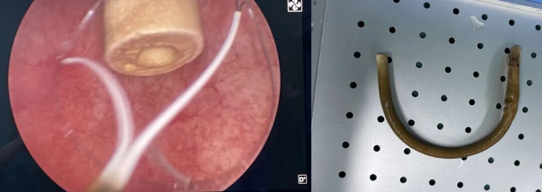 然而,在膀胱鏡檢查術中,醫(yī)生發(fā)現(xiàn)這根異物竟是半截被結石包裹的舊導尿管??紤]到激光破碎可能損傷膀胱黏膜,晏增亞當機立斷,決定調(diào)整手術方案。他與張佳晨醫(yī)生默契配合,利用簡易套索工具,精準套住異物一端,小心翼翼地調(diào)整角度,穩(wěn)步將這根潛藏多年的“陳年老物”完整取出。整個手術過程不到十分鐘,出血少、創(chuàng)傷小,既避免了器械破碎帶來的潛在損傷,又為患者大幅節(jié)約了治療費用。