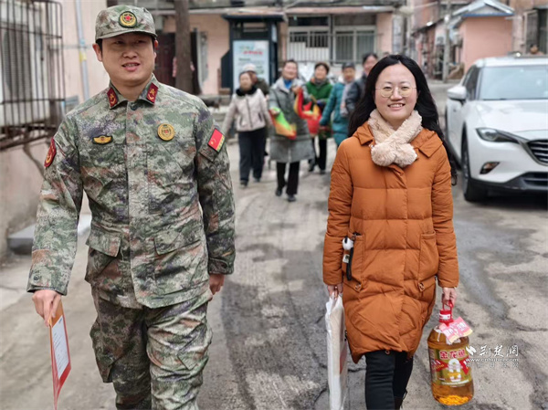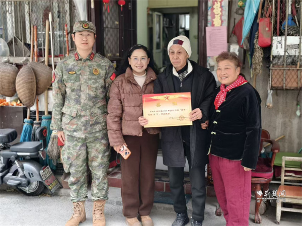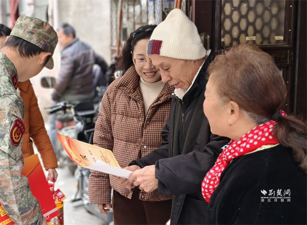 荊楚網(wǎng)(湖北日報網(wǎng))訊(通訊員 蘇楚雄 鐘霓 游薇 侯本瑞)1月29日,武昌區(qū)楊園街道電力新村社區(qū)鑼鼓聲響、熱鬧非凡。街道人武部、退役軍人服務站和社區(qū)工作人員組成“報喜小隊”為現(xiàn)役軍人家屬送去子女在部隊榮獲的“四有”優(yōu)秀學員榮譽證書,并送上慰問物資,傳遞對軍屬的崇高敬意和誠摯關(guān)懷。
