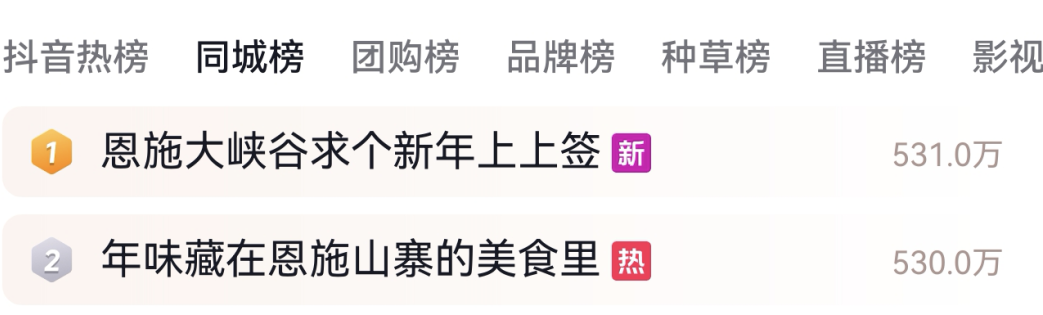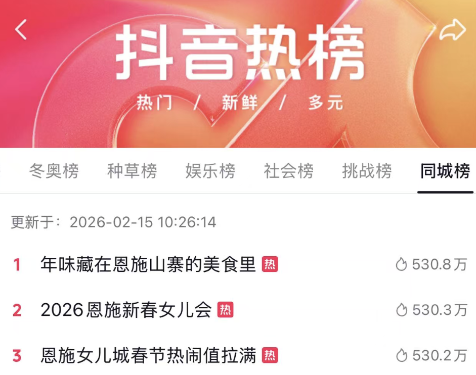 強大的宣傳矩陣,讓恩施火遍全網。打造的“恩施新春女兒會”“恩施女兒城春節(jié)熱鬧值拉滿”“年味藏在恩施山寨的美食里”“恩施大峽谷求個新年上上簽”四大熱點事件,強勢霸占抖音同城榜前三超10天。構建“主話題+子話題+互動話題”三級抖音傳播體系,#新春女兒會#2026我看過的燈會#刷NPC闖關賺銀票#來女兒會領個同頻搭子等4大熱點話題總瀏覽量達1.69億。