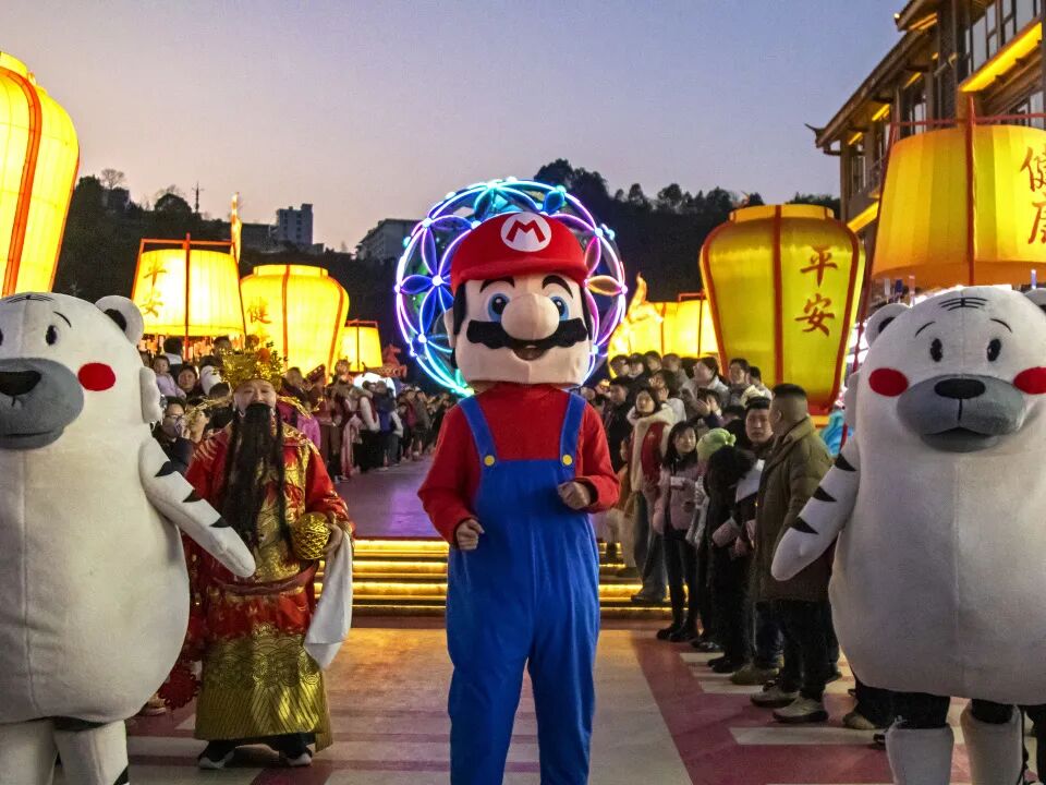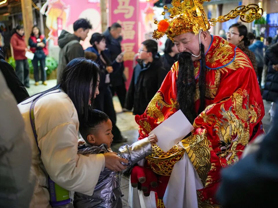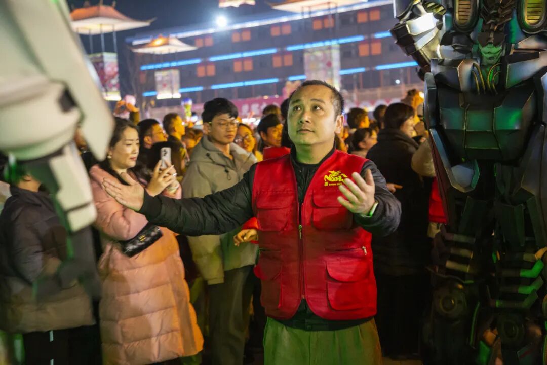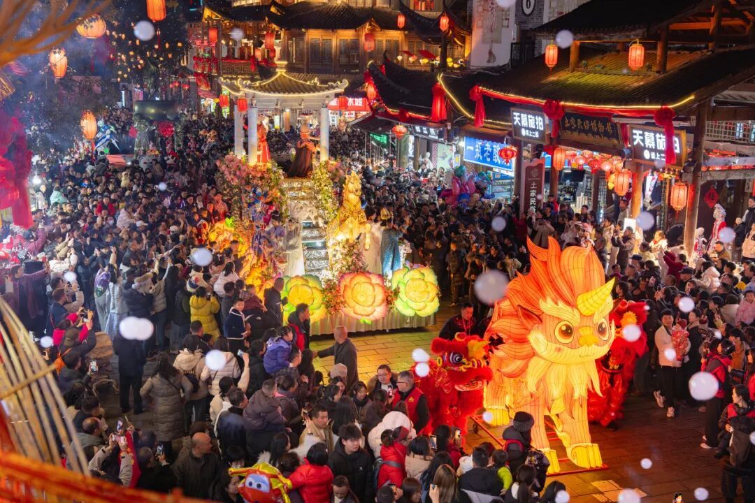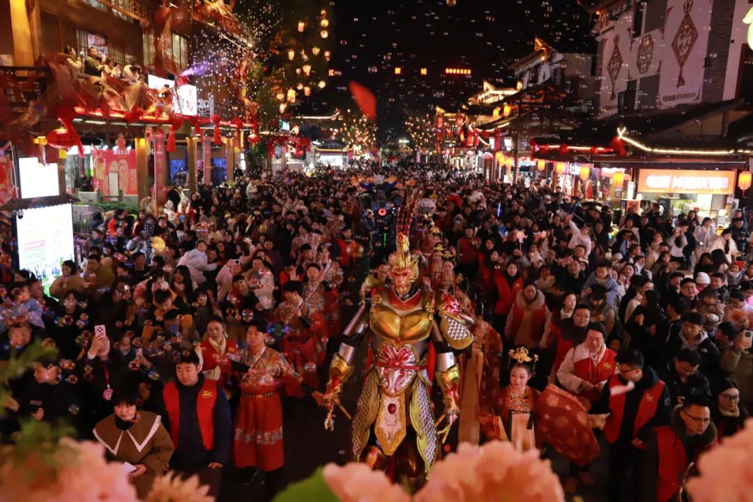 30余場馬年主題花車年獸巡游、超585場演出互動密集開展。七彩燈串裝飾的花車、身著盛裝的演員、威風的年獸、酷炫的變形金剛機甲、戴五彩儺面具的舞者組成的巡游方陣,傳統與現代碰撞,氛圍感拉滿。