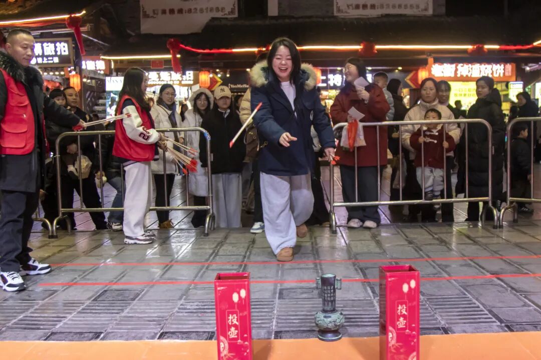 創(chuàng)新推出“新春銀票”實景游戲,活動現場顏值與實力雙在線的上官婉兒、李清照、孫權、財神爺等NPC穿梭這和游客玩成語接龍、投壺、華容道等趣味游戲。游客贏得的“銀票”可兌換摔碗酒、打糍粑等民俗體驗,換取恩施特產、文創(chuàng),還能參與抽獎贏折疊手機、口袋相機。來自重慶等地的游客第一天就抽取到幸運大獎,來恩施過年的興奮無以言表。景區(qū)內設置的“立馬回童年”“奇跡仙蹤”懷舊區(qū),踢毽子、丟福袋等小游戲,勾起不少游客的童年回憶。