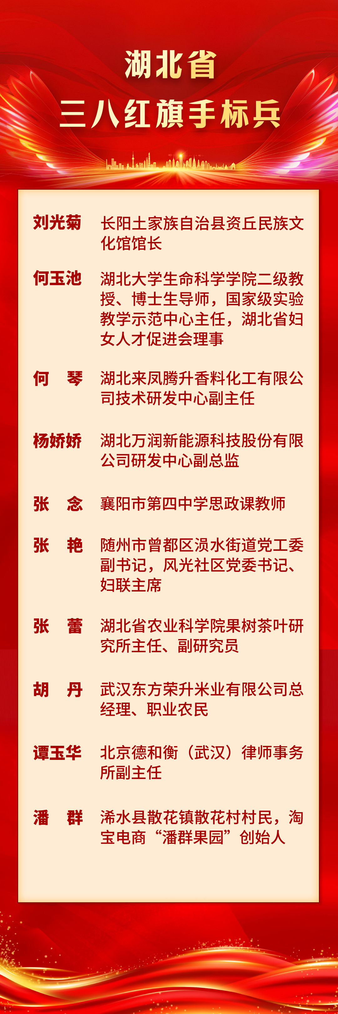 為表彰先進(jìn)、樹立榜樣,充分發(fā)揮先進(jìn)典型的示范引領(lǐng)作用,激勵全省廣大婦女以更加昂揚(yáng)的姿態(tài)聚力建支點(diǎn)、實(shí)干開新局,湖北省人力資源和社會保障廳、湖北省婦女聯(lián)合會決定,授予劉光菊等10人湖北省三八紅旗手標(biāo)兵稱號;授予董凌莉等90人湖北省三八紅旗手稱號;授予武漢市自然資源保護(hù)利用中心江南分中心等70個單位湖北省三八紅旗集體稱號。