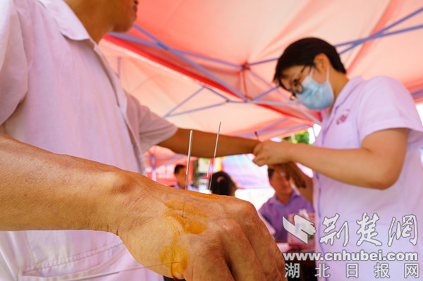 46歲的黃炳程走路時(shí),常常用手撐著腰。今年3月,他突發(fā)腰痛?,F(xiàn)場,宜城中醫(yī)醫(yī)院針灸科主治醫(yī)師林蘭茹在其手部扎完數(shù)枚針后,他大呼止痛效果很明顯。