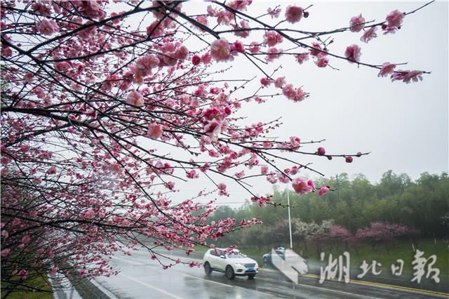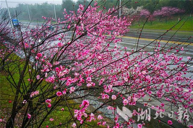 2月13日,咸寧市咸安區(qū)桂鄉(xiāng)大道兩旁的紅梅花在風雨中含笑迎賓。