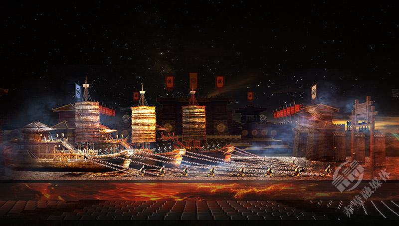 2000多年前,諸葛亮借的東風(fēng),是摧枯拉朽、克敵制勝的戰(zhàn)火雄風(fēng);2000多年后,三國赤壁古戰(zhàn)場借的東風(fēng),則是凝心聚氣、砥礪奮進(jìn)的時(shí)代之風(fēng)。演出將赤壁之戰(zhàn)這盤歷史大棋置于天地之間,以三國群雄為弈者,以演員和觀眾為棋子,利用光影特效與舞美裝置的變換,將戰(zhàn)役的多個(gè)關(guān)鍵情節(jié)進(jìn)行藝術(shù)化提煉與重構(gòu),運(yùn)用聲、光、電等現(xiàn)代舞美技術(shù),將歷史與現(xiàn)實(shí)、虛擬與真實(shí)融為一體,構(gòu)建起一個(gè)戰(zhàn)火紛飛、羽箭穿空的三國世界,讓赤壁之戰(zhàn)從史書中的符號(hào)躍升為可觸摸、可參與的精神場域。
