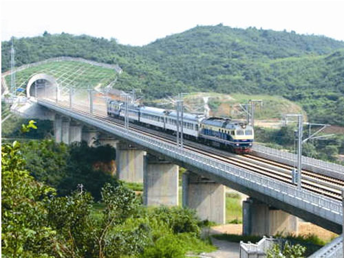 大瑤山位于湘粵交界之處,素有“南嶺險(xiǎn)關(guān)”之稱。上世紀(jì)80年代,修建衡陽到廣州復(fù)線,建設(shè)者用7年時間在這里修建隧道,全長14公里,是當(dāng)時國內(nèi)最長的雙線電氣化隧道。這次,武廣客專的方案是修建隧道群,由1號、2號、3號隧道組成,橋隧相連。3條隧道全長25公里,用了3年半全部竣工。