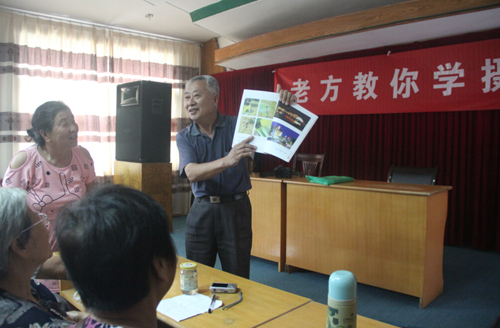 8月2日下午,在經過半天休整之后,方老師開始為團員們講課!拔覀兝夏耆藨撚凶约旱呐d趣和追求,要學會自己找樂!薄艾F(xiàn)在小孩都是老年人在帶,我們學會了攝影就可以教孩子,對他們將來也有好處!狈嚼蠋煹囊幌,頓時就讓許多團員萌生了學攝影的想法。接著,他向團員們展示了自己拍攝的眾多精彩照片,并拿出一本攝影圖集供大家傳閱!斑@本圖集里,都是我在老年大學教書時,學員們拍的照片。最大的學員都80多歲了,但是照片拍的特別好。相信大家通過學習,也可以拍的如此精彩!狈嚼蠋煹脑,給了在座的老人極大的信心,大家也學的更加認真。