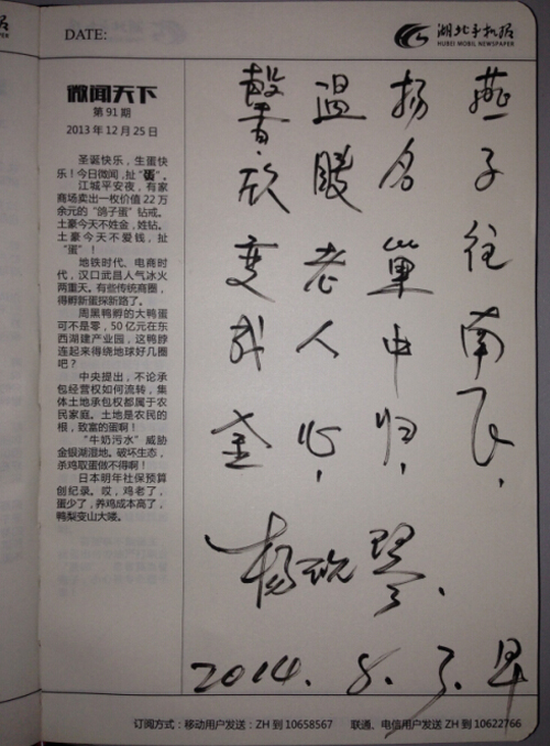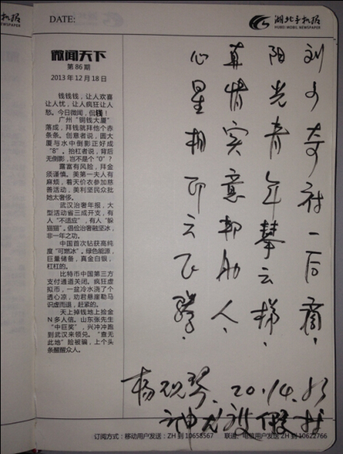 61歲的楊婆婆特有才,給方老師和手機報兩位工作人員各贈詩一首