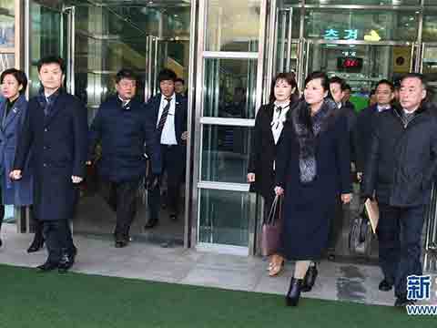 1月21日,朝鮮三池淵管弦樂團(tuán)團(tuán)長(zhǎng)玄松月(前右二)通過朝韓邊境的韓國京畿道坡州市京義線韓朝出入境事務(wù)所前往韓國首爾。當(dāng)日,朝鮮方面派遣三池淵管弦樂團(tuán)團(tuán)長(zhǎng)玄松月率領(lǐng)的考察團(tuán)經(jīng)由京義線陸路抵韓,為平昌冬奧會(huì)之際舉行的文藝演出進(jìn)行事先考察。(新華網(wǎng))