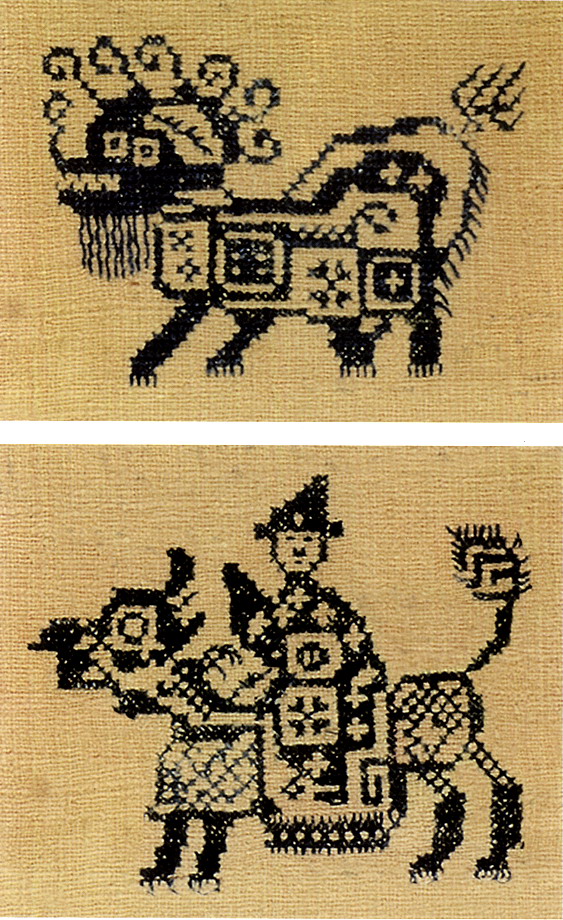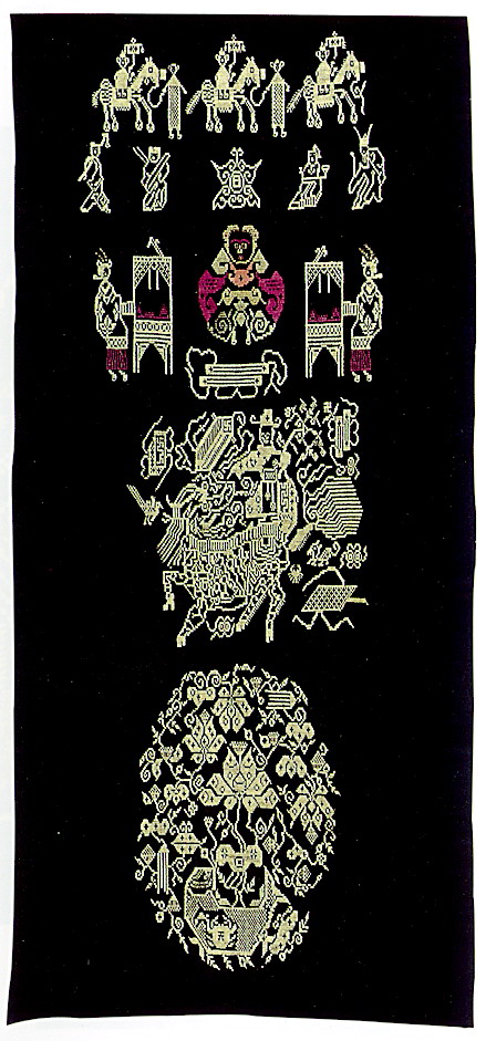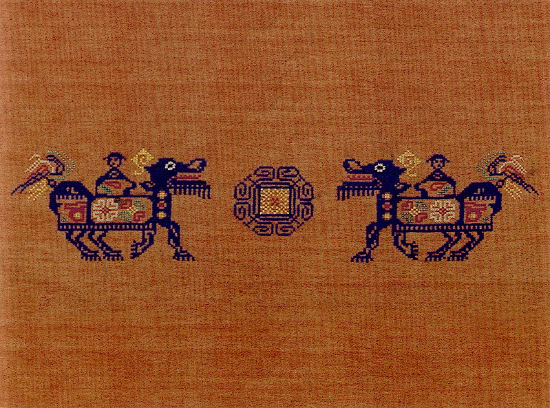 土錦以“通以斷緯”為編織手段,受巴楚文化的影響:1、紋飾既抽象又有形,土錦圖案來自對大自然的感受,身邊的物象也是編織者寄情抒懷的選擇,不論是對動物或用具,還是對天象星座,都能運用夸張變形的手法,達(dá)到抽象裝飾美的效果。2、色彩上注重原色與復(fù)色的互補:運用紅、黃、藍(lán)三色,并延伸以赤、黃、青、白、黑為五正色。