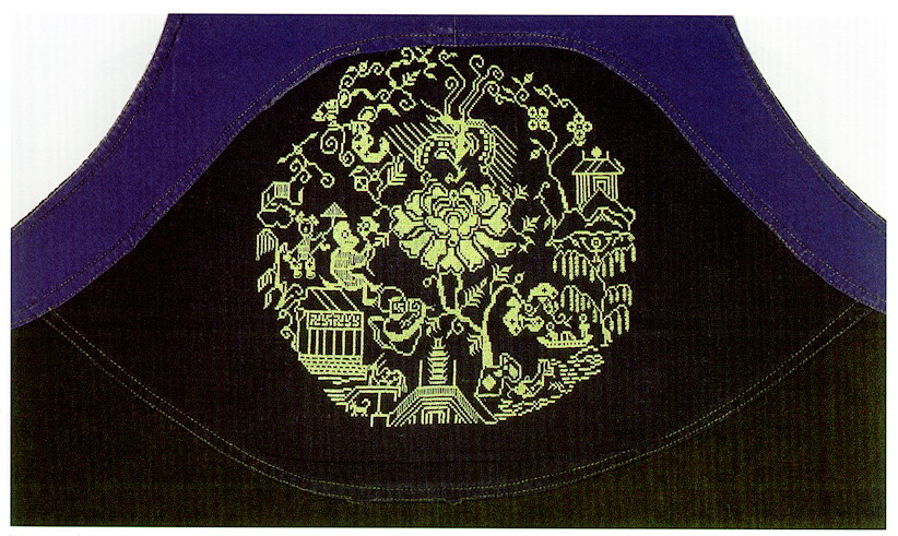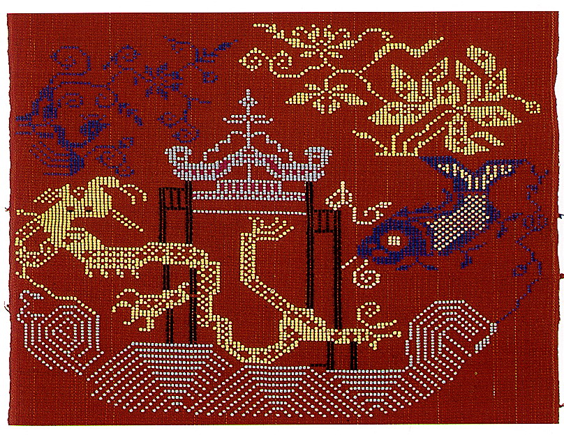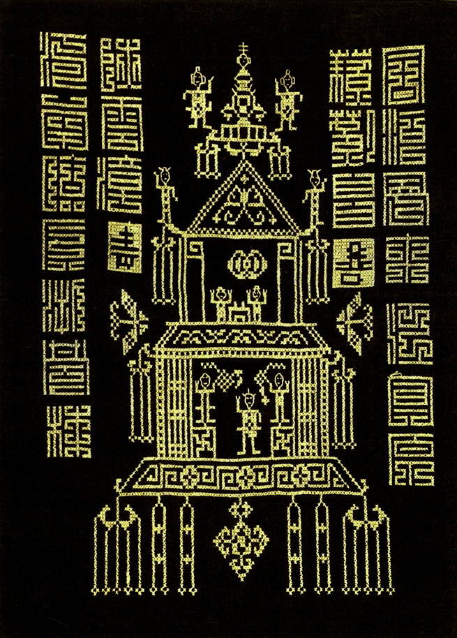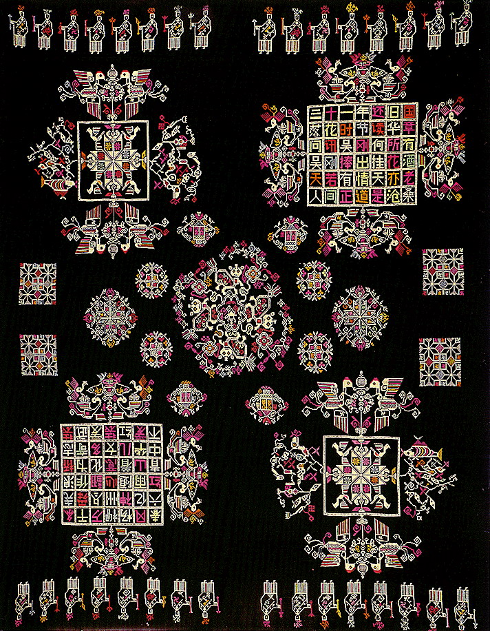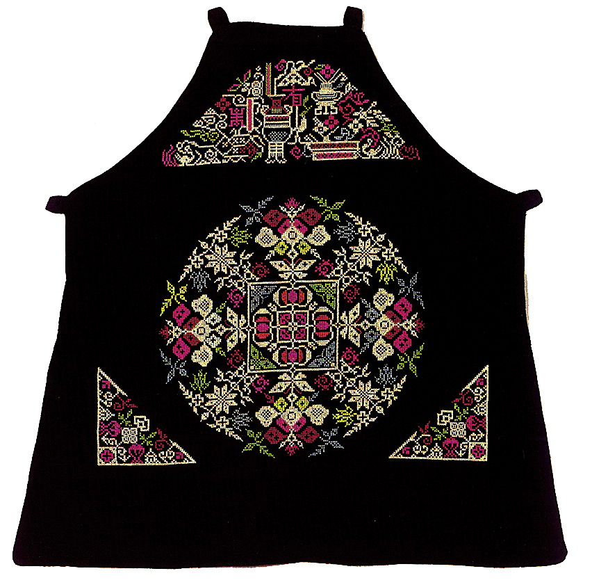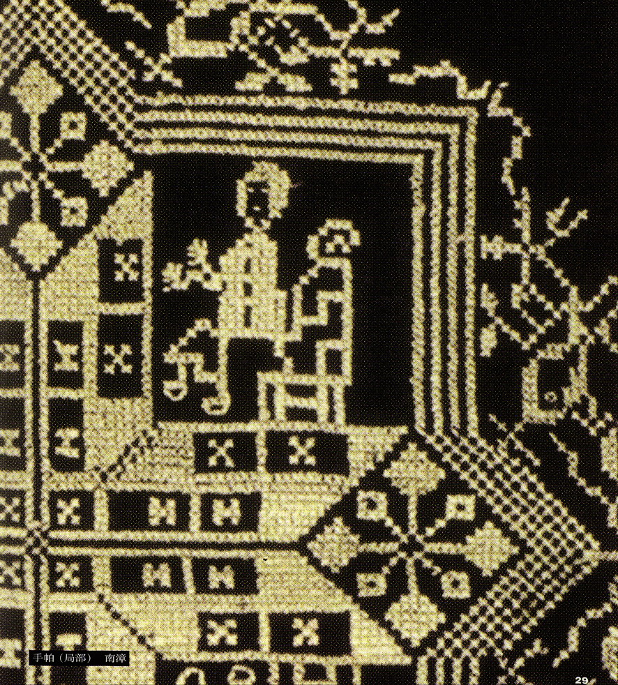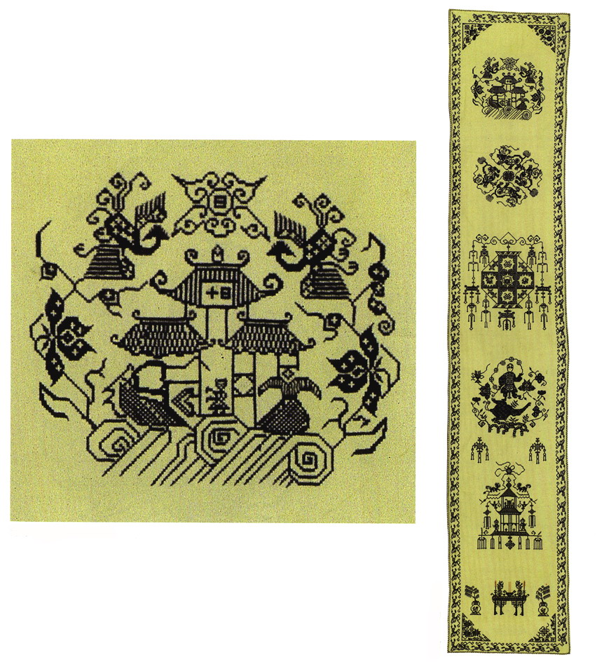 挑花針法有平挑花和十字花兩種,即在平布上面依紗眼用繡花針扣上十字形,然后以此為骨架,填置上多種需要花紋,采取反面挑花正面看手法,其優(yōu)點有二:一是保持清潔;二是便于打結(jié)。構(gòu)圖多是幾何圖形,也有動植物的幾何圖案。其結(jié)構(gòu)主要有對稱式、交叉式、二方連續(xù)式、斜菱形、單獨紋樣等等。圖案花紋既規(guī)整而又變化多姿,給人以舒暢愉快的感覺。