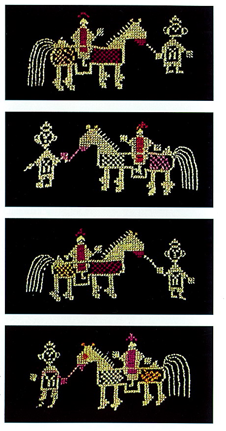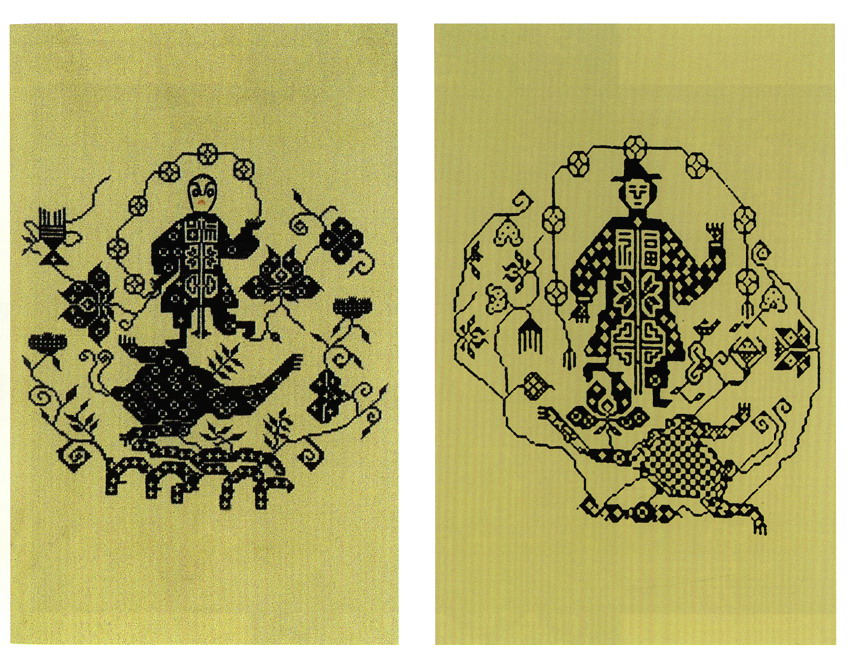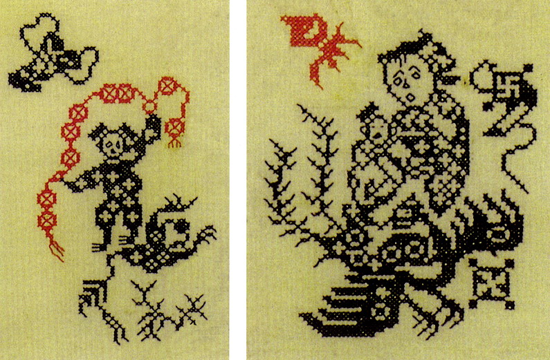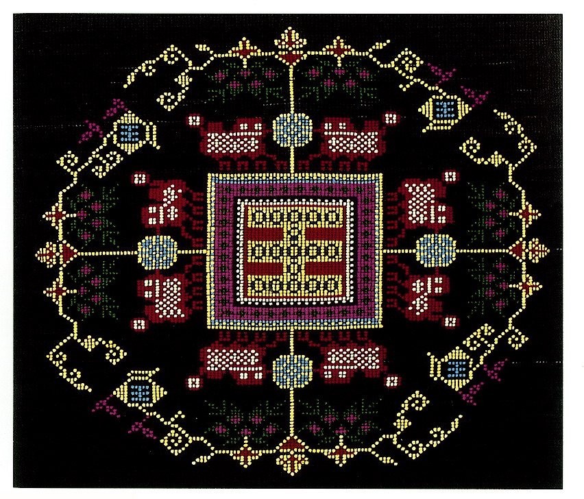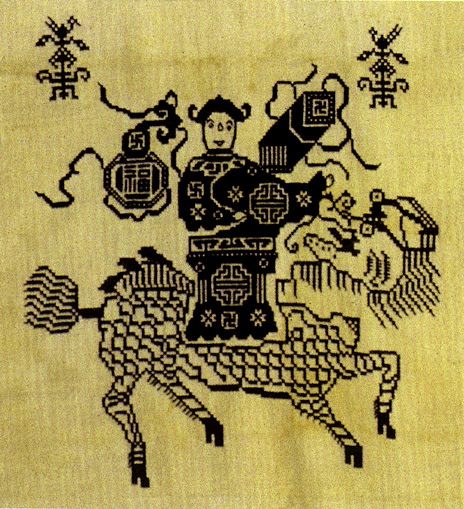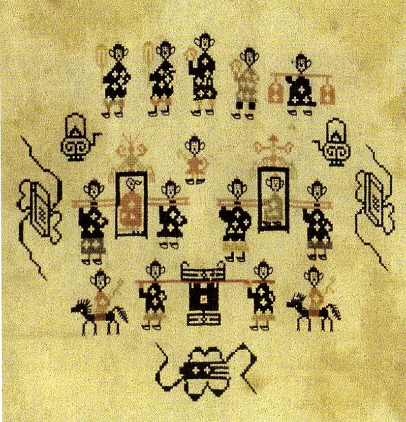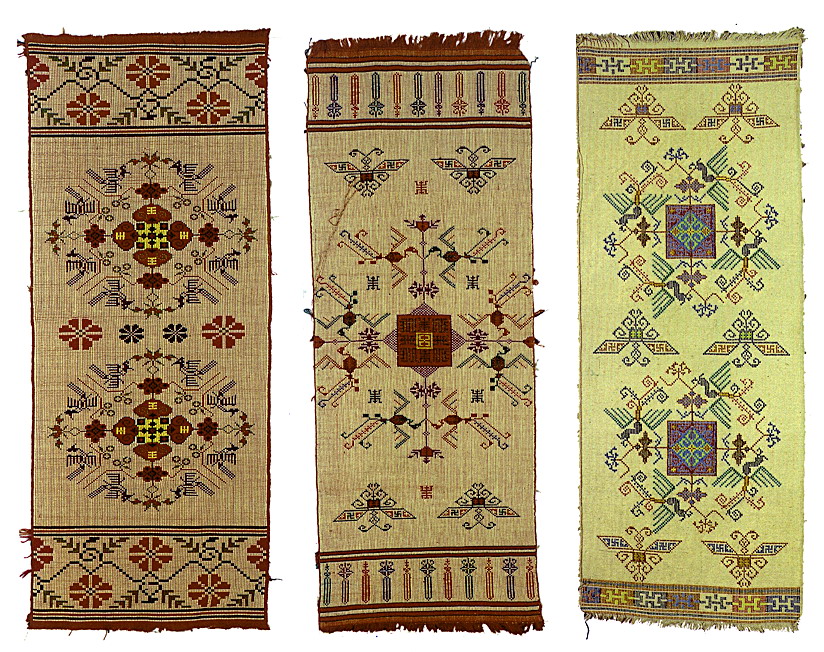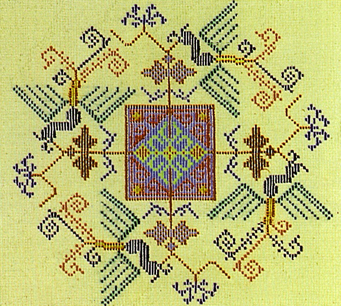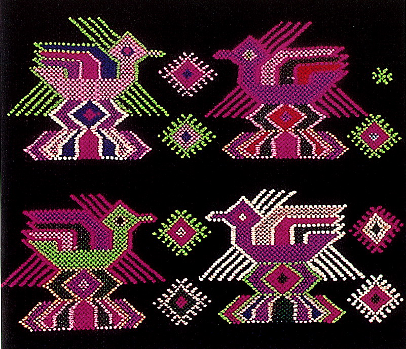 挑花針法有平挑花和十字花兩種,即在平布上面依紗眼用繡花針扣上十字形,然后以此為骨架,填置上多種需要花紋,采取反面挑花正面看手法,其優(yōu)點有二:一是保持清潔;二是便于打結(jié)。構(gòu)圖多是幾何圖形,也有動植物的幾何圖案。其結(jié)構(gòu)主要有對稱式、交叉式、二方連續(xù)式、斜菱形、單獨紋樣等等。圖案花紋既規(guī)整而又變化多姿,給人以舒暢愉快的感覺。