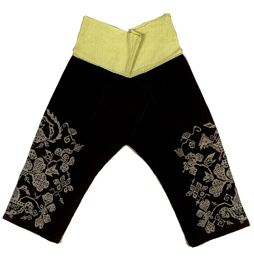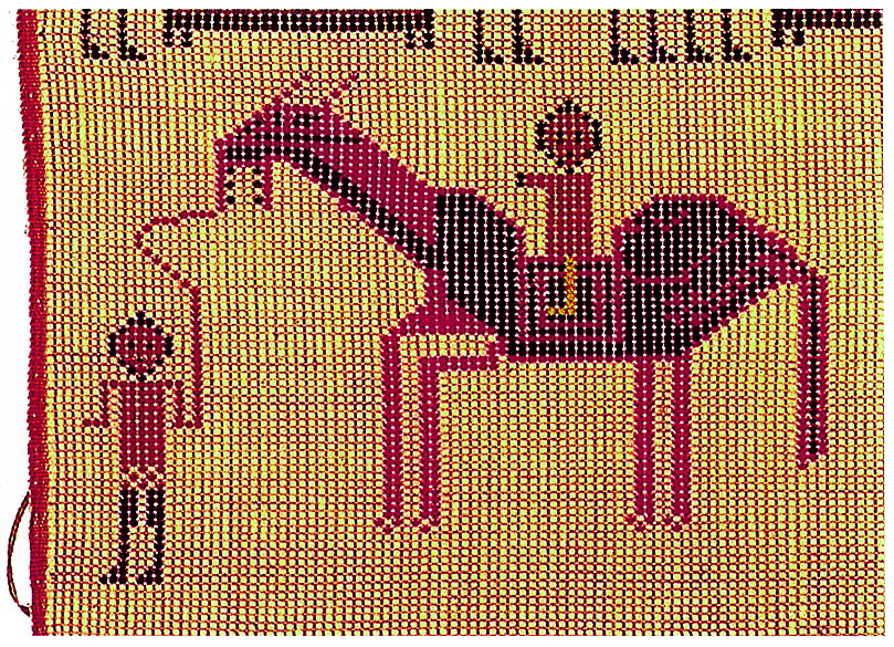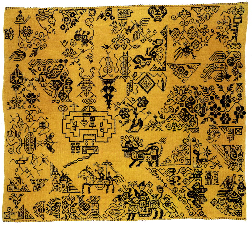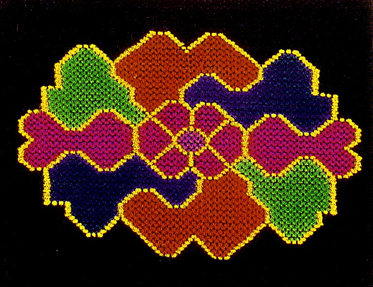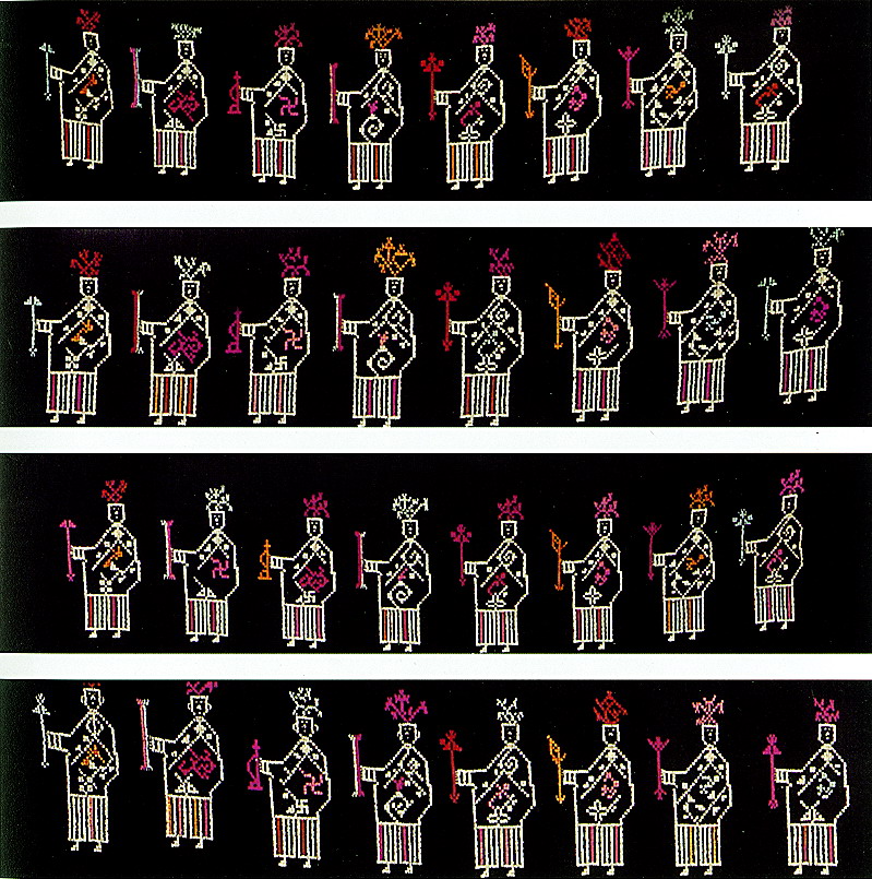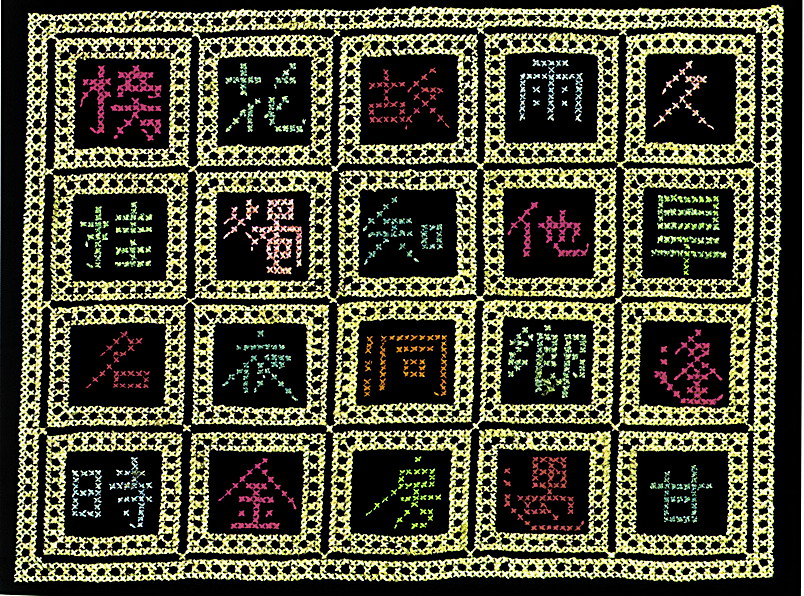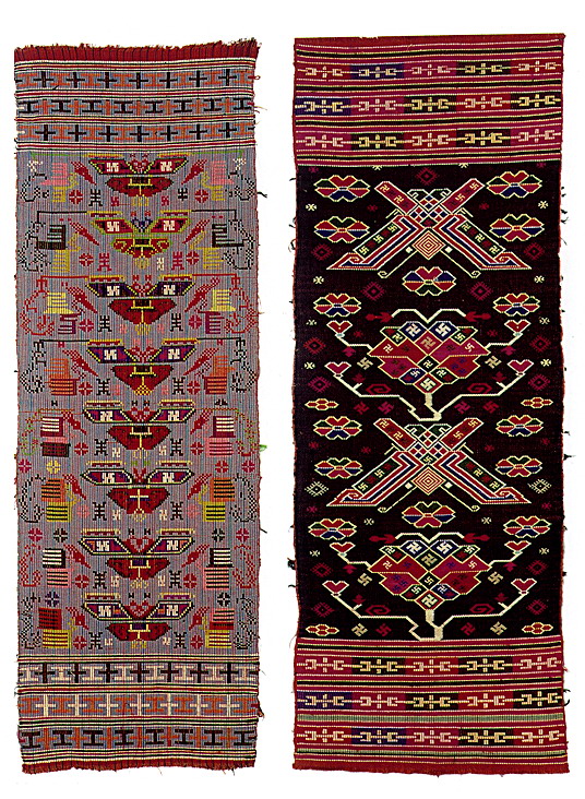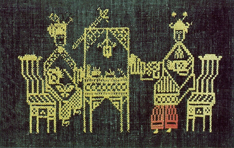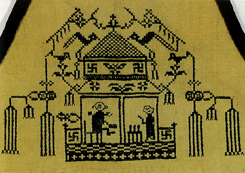 挑花針法有平挑花和十字花兩種,即在平布上面依紗眼用繡花針扣上十字形,然后以此為骨架,填置上多種需要花紋,采取反面挑花正面看手法,其優(yōu)點有二:一是保持清潔;二是便于打結(jié)。構(gòu)圖多是幾何圖形,也有動植物的幾何圖案。其結(jié)構(gòu)主要有對稱式、交叉式、二方連續(xù)式、斜菱形、單獨紋樣等等。圖案花紋既規(guī)整而又變化多姿,給人以舒暢愉快的感覺。